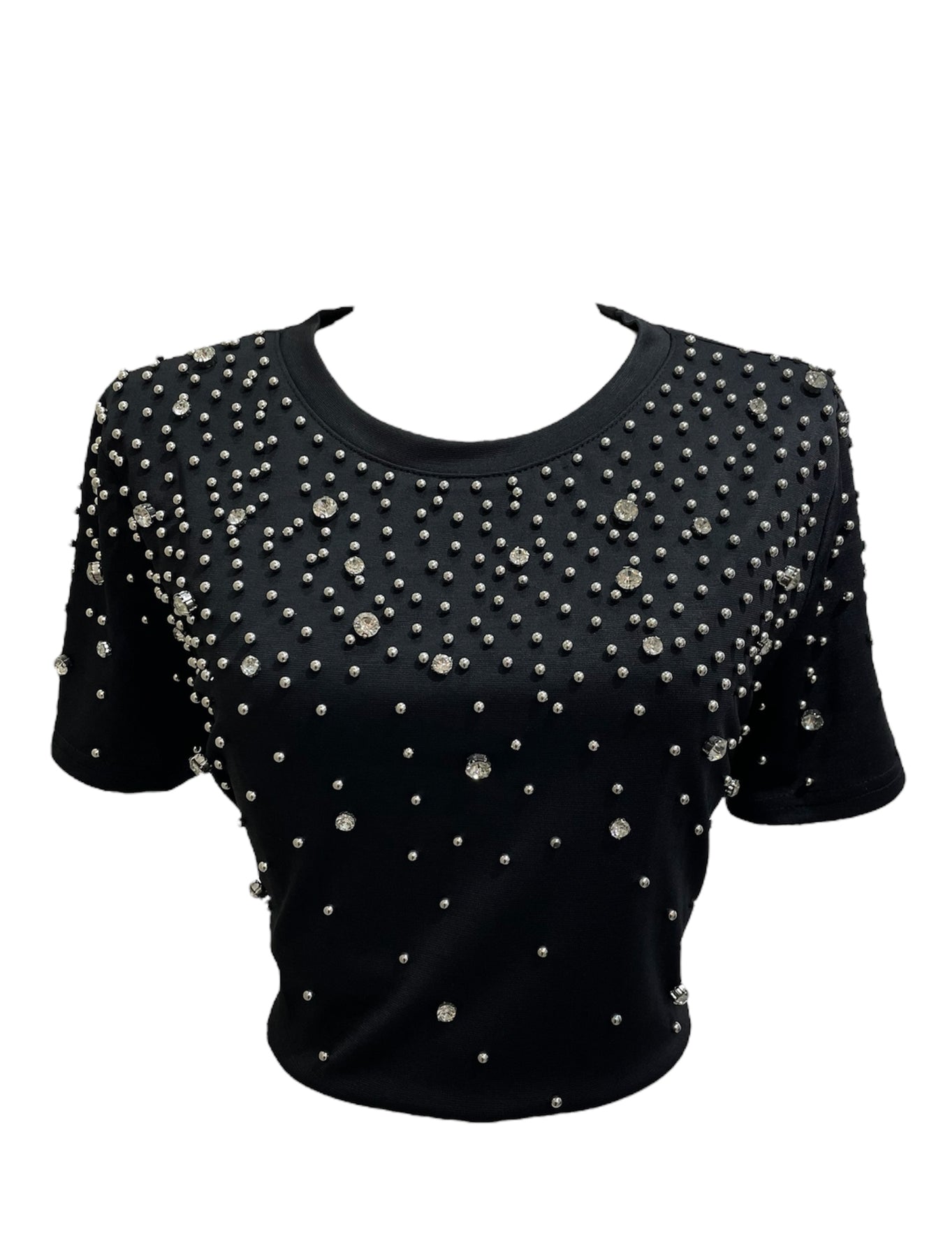 Confeccionada en poliéster de alta calidad, esta blusa negra ofrece un tacto suave y un ajuste cómodo. El diseño de mangas normales, que llegan hasta más arriba del codo, aporta un toque de elegancia y versatilidad. Los detalles de pequeñas piedras blancas, meticulosamente colocadas en la parte frontal, añaden un toque de brillo y distinción.