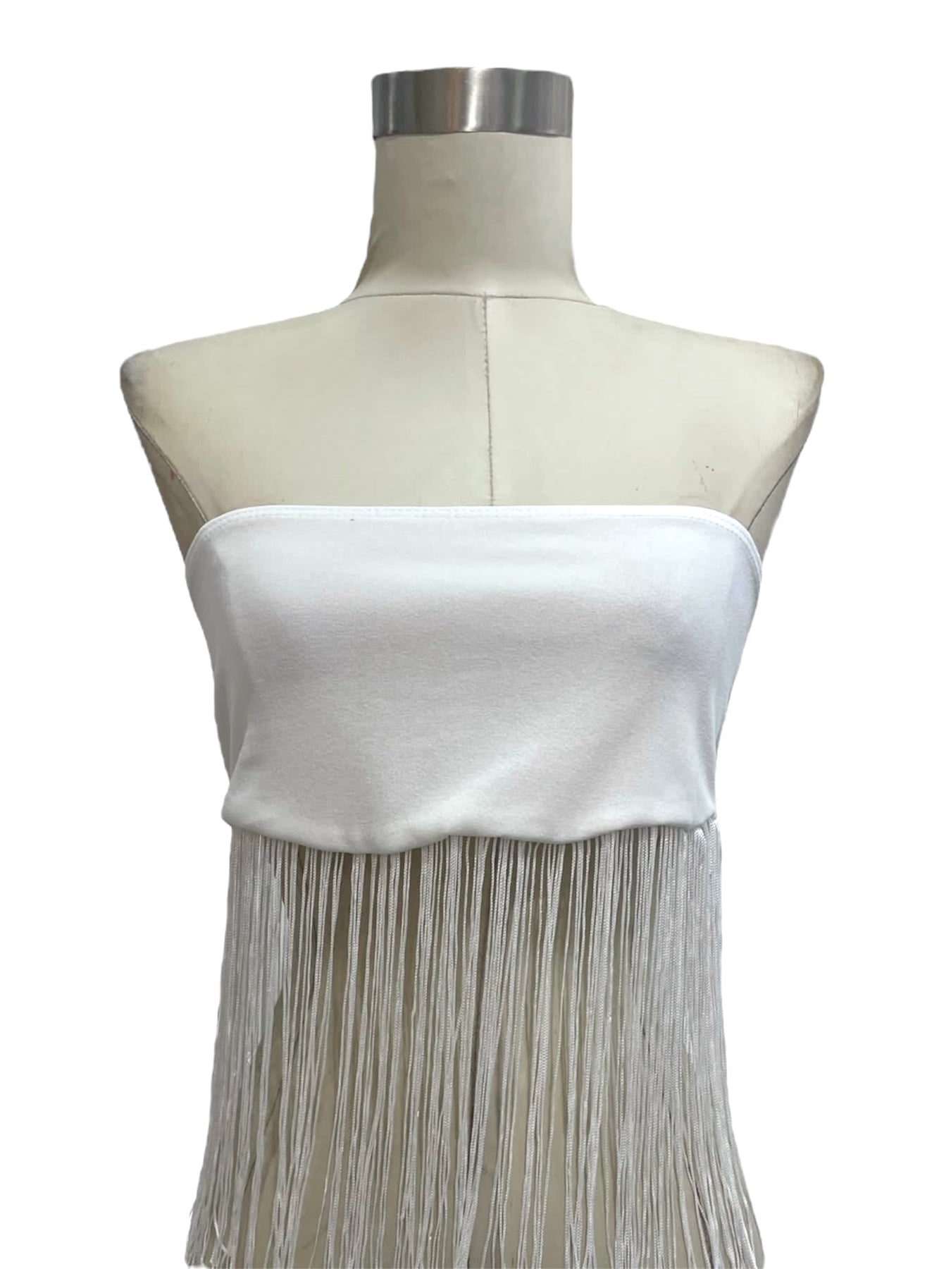 Esta es tu oportunidad de adquirir una prenda fresca y con carácter que te hará sentir segura y con estilo en nuestra ciudad. ¡Aprovecha nuestra oferta exclusiva y sumérgete en la brisa festiva con el top corto blanco 'Brisa Festiva' de flecos de Be Fashion NY!