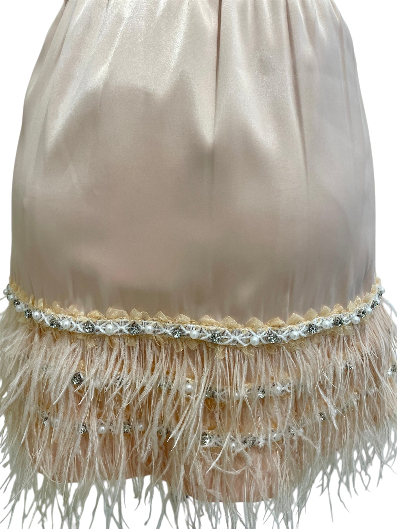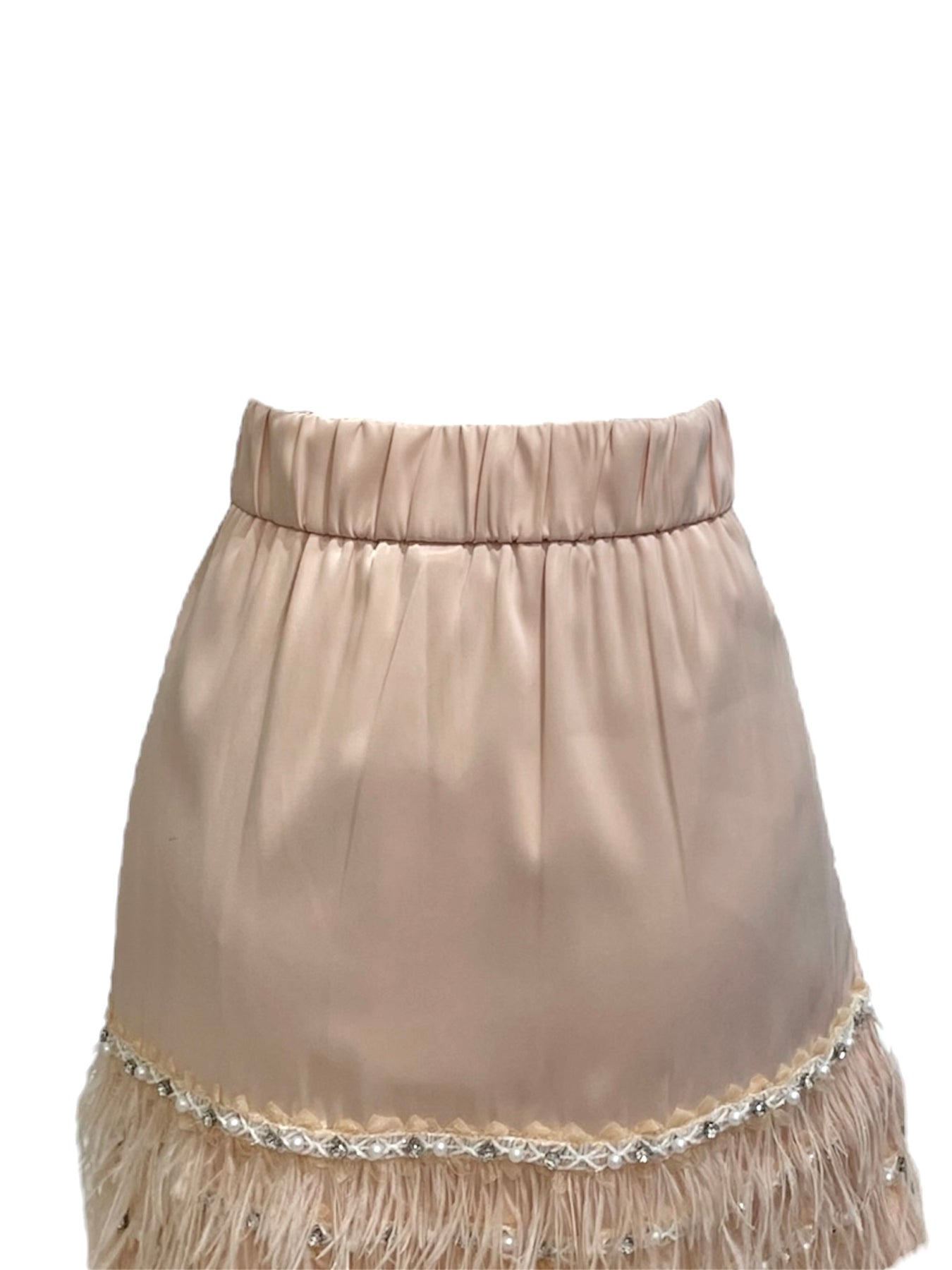 Esta es tu oportunidad de adquirir una prenda espectacular y con encanto que te hará sentir segura y deslumbrante en nuestra ciudad. ¡Aprovecha nuestra oferta exclusiva y déjate llevar por el glamour de ensueño con la falda rosa 'Sueño Alado' con plumas y strass de Be Fashion NY!