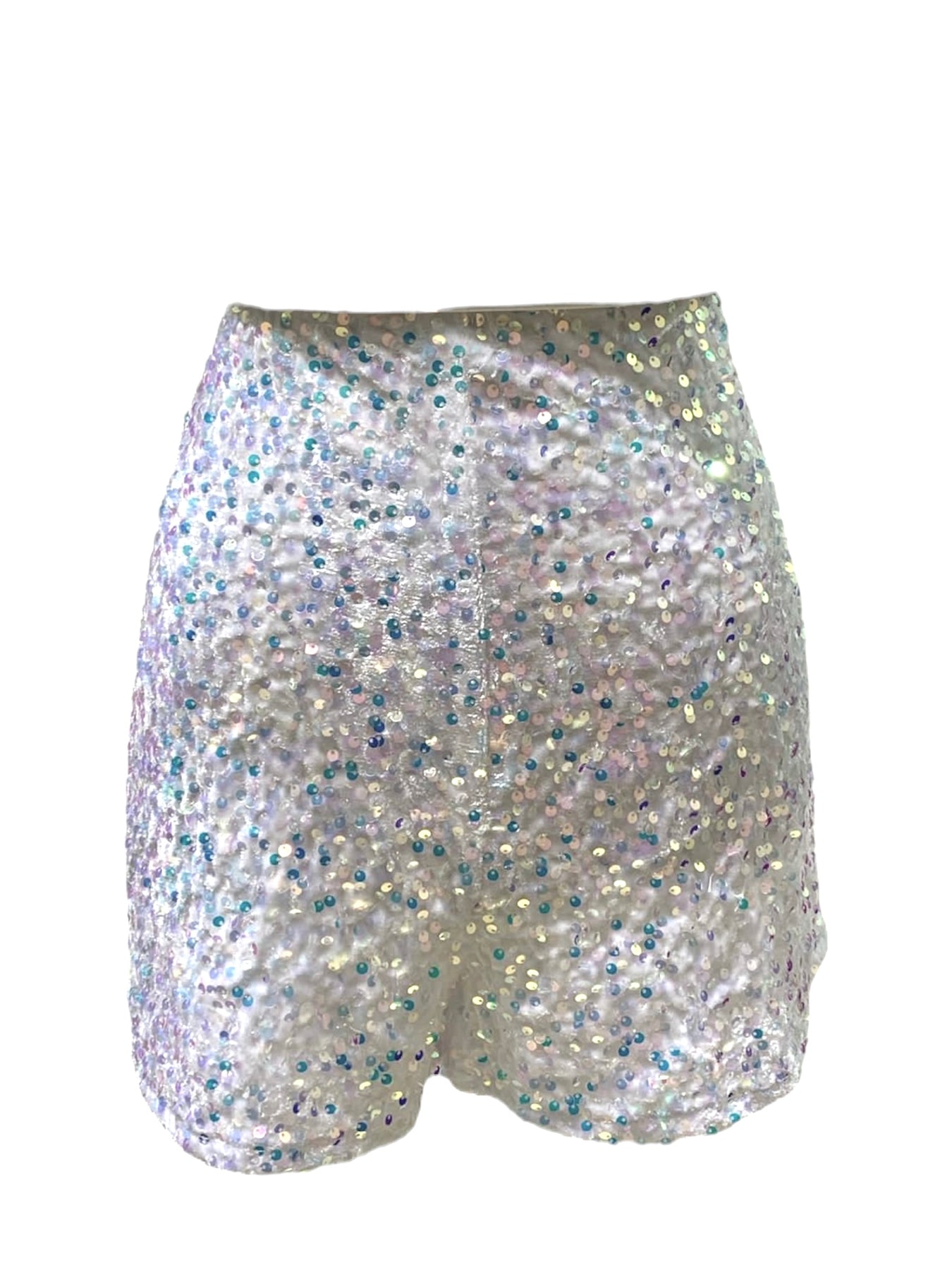 Confeccionado con lentejuelas de alta calidad y forrado para mayor comodidad, este short multicolor ofrece un brillo lujoso y un ajuste impecable. El diseño de lentejuelas multicolor crea un efecto deslumbrante y llamativo, perfecto para crear looks únicos y divertidos.