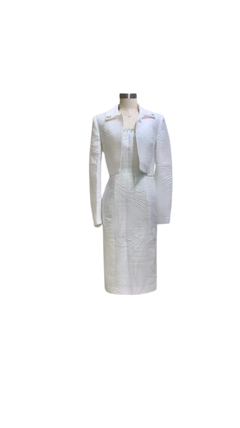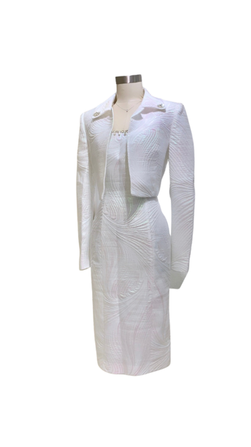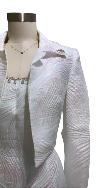 Be Fashion NY presenta con distinción el conjunto de Vestido y Blazer Blanco 'Aurora Nupcial', una combinación que fusiona la pureza inmaculada con el brillo de las joyas y la delicadeza de un toque de color sutil. que busca un estilo majestuoso, estructurado y lleno de luz para eventos de alta distinción , este conjunto es perfecto para ceremonias, galas o para una presencia de lujo incomparable. Confeccionado en un tejido blanco de alta calidad, tanto el vestido como el blazer ofrecen una base sofisticada. El Blazer presenta un corte estructurado y elegante, realzado por sutiles detalles en rosa claro brillante que se integran en la textura del tejido, creando un efecto de iridiscencia etérea. El Vestido interior, que acompaña perfectamente, también luce esta base de textura sutil. El lujo se amplifica con las Piedras Brillantes que pueden adornar el blazer.