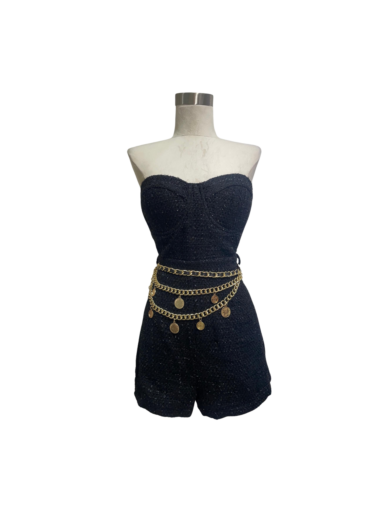 Esta es tu oportunidad de adquirir una prenda impactante y elegante que te hará sentir segura y deslumbrante. ¡Aprovecha nuestra oferta exclusiva y envuélvete en la elegancia audaz de la braga corta strapless negra 'Noche de Oro' con cinturón dorado de Be Fashion NY!