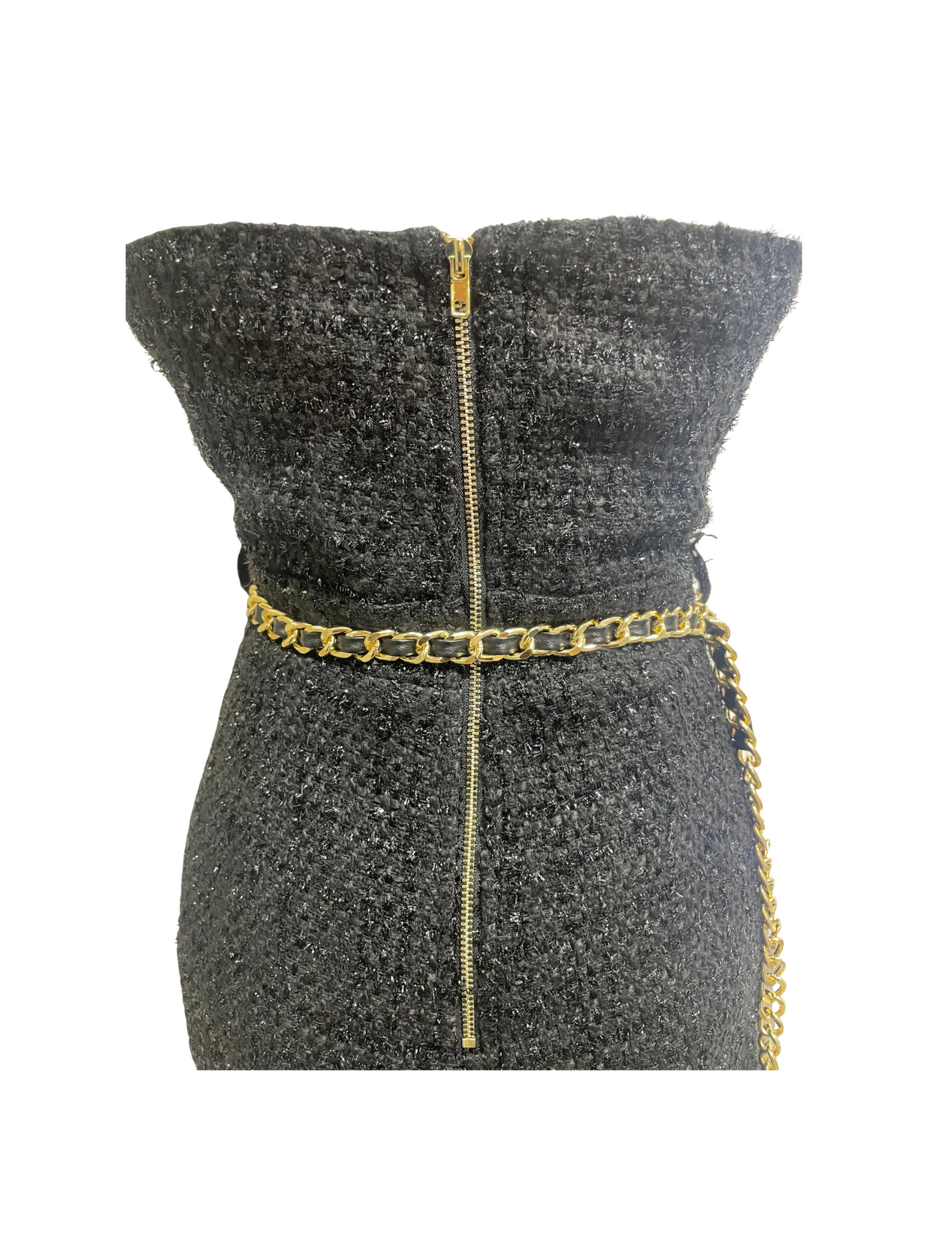 Be Fashion NY presenta con audacia la braga corta strapless negra 'Noche de Oro', una pieza que fusiona la sofisticación atemporal del negro con la sensualidad de un corte strapless y el lujo de un cinturón dorado.
