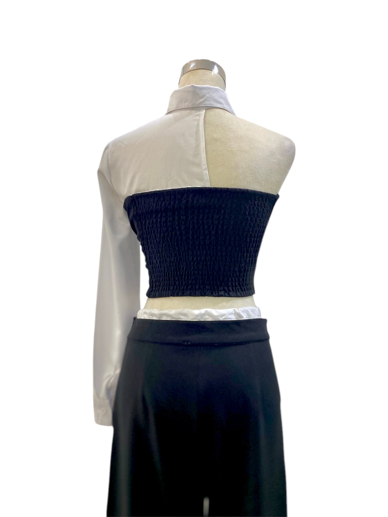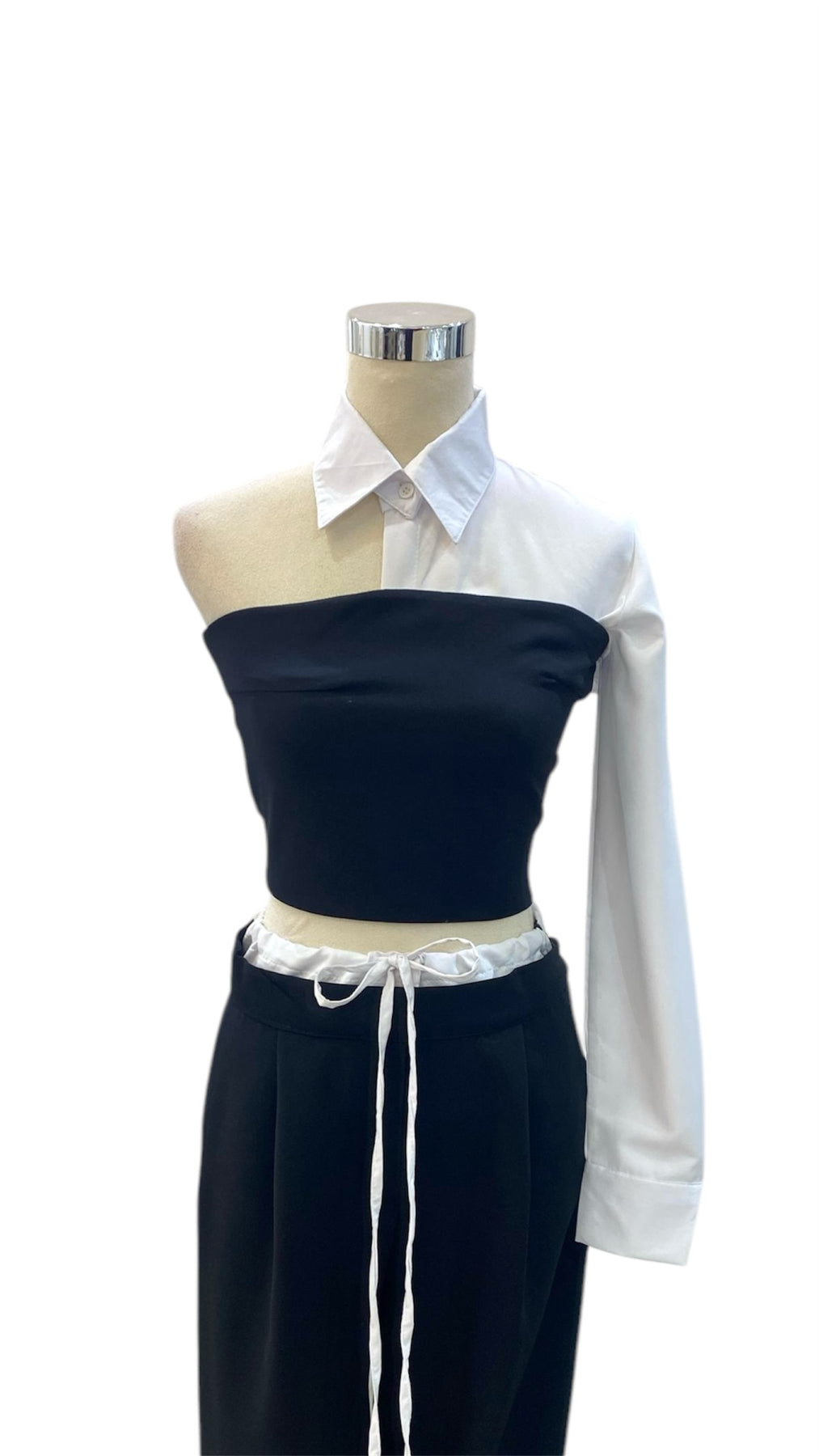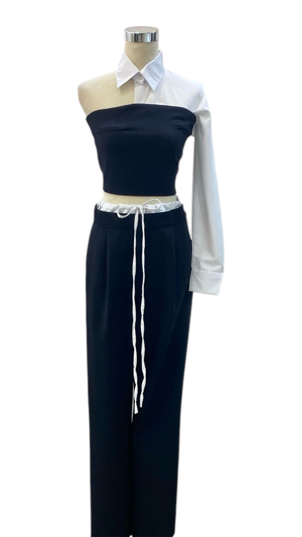 Confeccionado en poliéster de alta calidad, este set negro ofrece un tacto suave y un ajuste cómodo. La camisa, con un diseño asimétrico de una sola manga, aporta un toque de originalidad y estilo distintivo. La manga blanca, junto con el cuello tipo camisa, crea un contraste elegante y moderno. El pantalón negro, con pretina, complementa la camisa y crea un look coordinado y sofisticado. Los detalles cuidadosamente elaborados, como las costuras y los acabados, garantizan un look impecable.