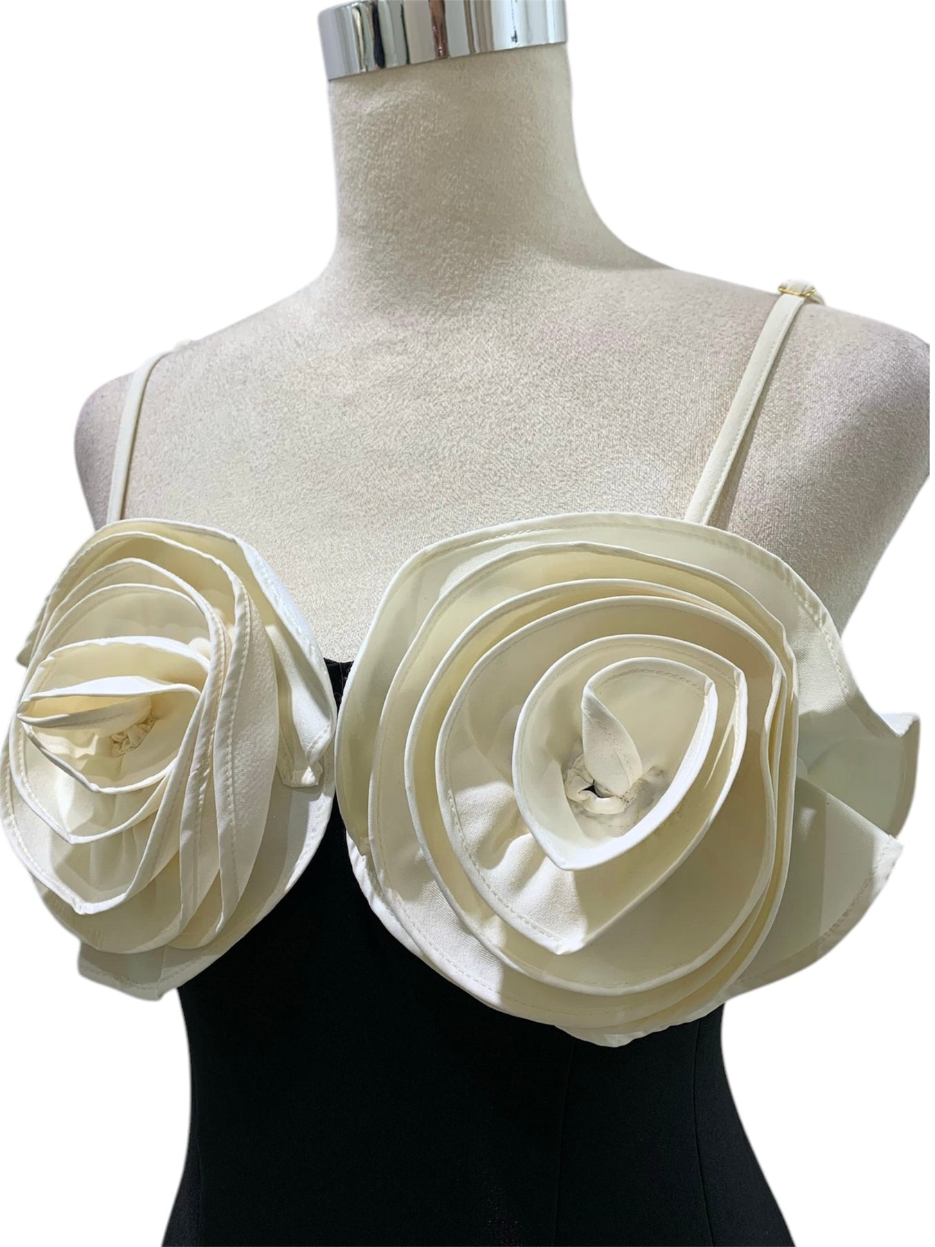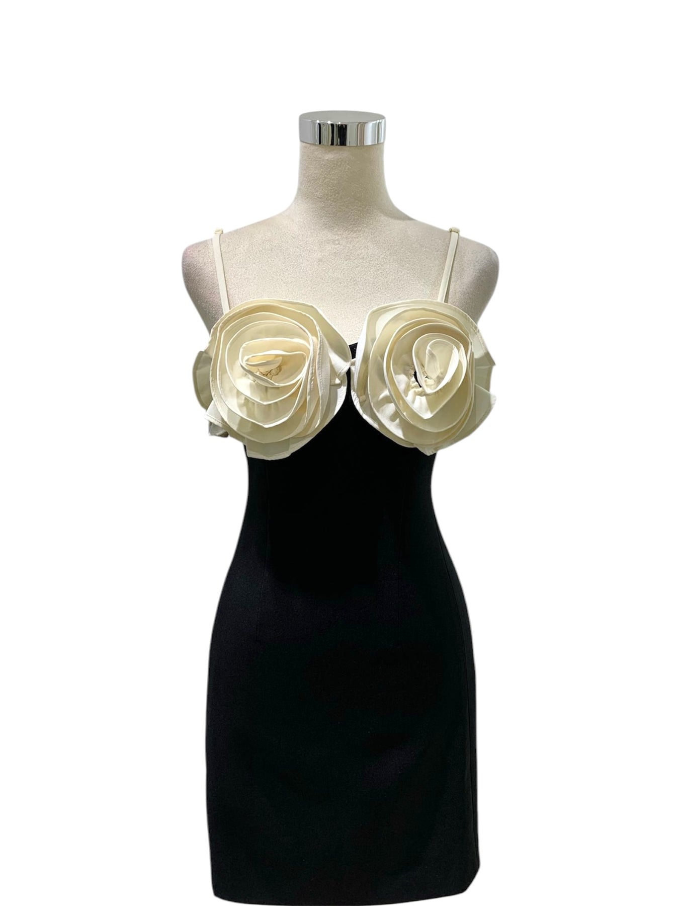 Confeccionado en poliéster de alta calidad, este vestido se ajusta al cuerpo de manera impecable, creando una silueta elegante y favorecedora. El largo, un poco más abajo de las rodillas, aporta un toque de sofisticación. Las tiras que sujetan el vestido realzan la figura y añaden un toque de sensualidad. El detalle de las dos rosas blancas tono perla en la parte de los senos es el punto focal del vestido, aportando un toque de glamour y originalidad.